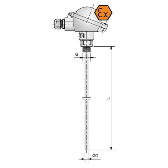 De Sensor besteet aus engem austauschbaren Mooss Insert, engem baussenzege Schutzrohr (Thermowell) an engem Aluminiumverbindungskapp wou d'Montéierung vun engem Temperatursender mat engem 4-20 mA Ausgangssignal / HART® oder Profibus®PA méiglech ass.