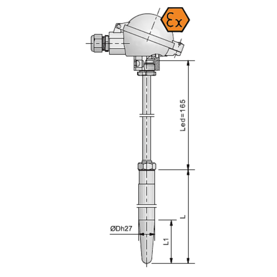 De Sensor besteet aus engem austauschbaren Moossinsatz, engem gebohrten Thermowell, engem Hals an engem Aluminiumverbindungskapp wou d'Montage vun engem Temperatursender mat engem 4-20 mA Ausgangssignal / HART® oder Profibus®PA méiglech ass.
