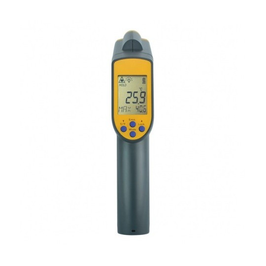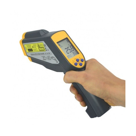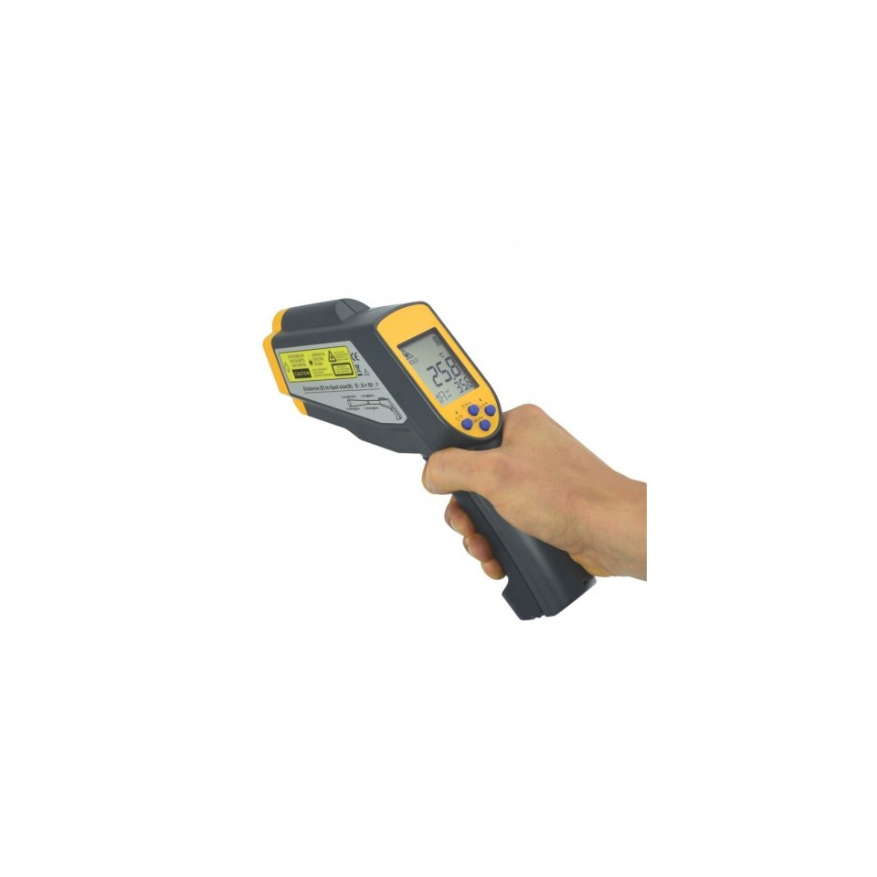 Le RayTemp 38 est un thermomètre infrarouge professionnel sans contact en forme de pistolet avec double alignement de points laser. Le thermomètre intègre un rapport optique de 50: 1 (rapport distance / diamètre cible), ce qui permet aux utilisateurs de mesurer de petites cibles à distance. L'utilisateur se tient à une distance sûre et confortable de la cible, pointe le thermomètre sur la surface à mesurer, appuie sur la gâchette et lit instantanément la température.