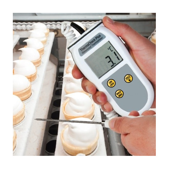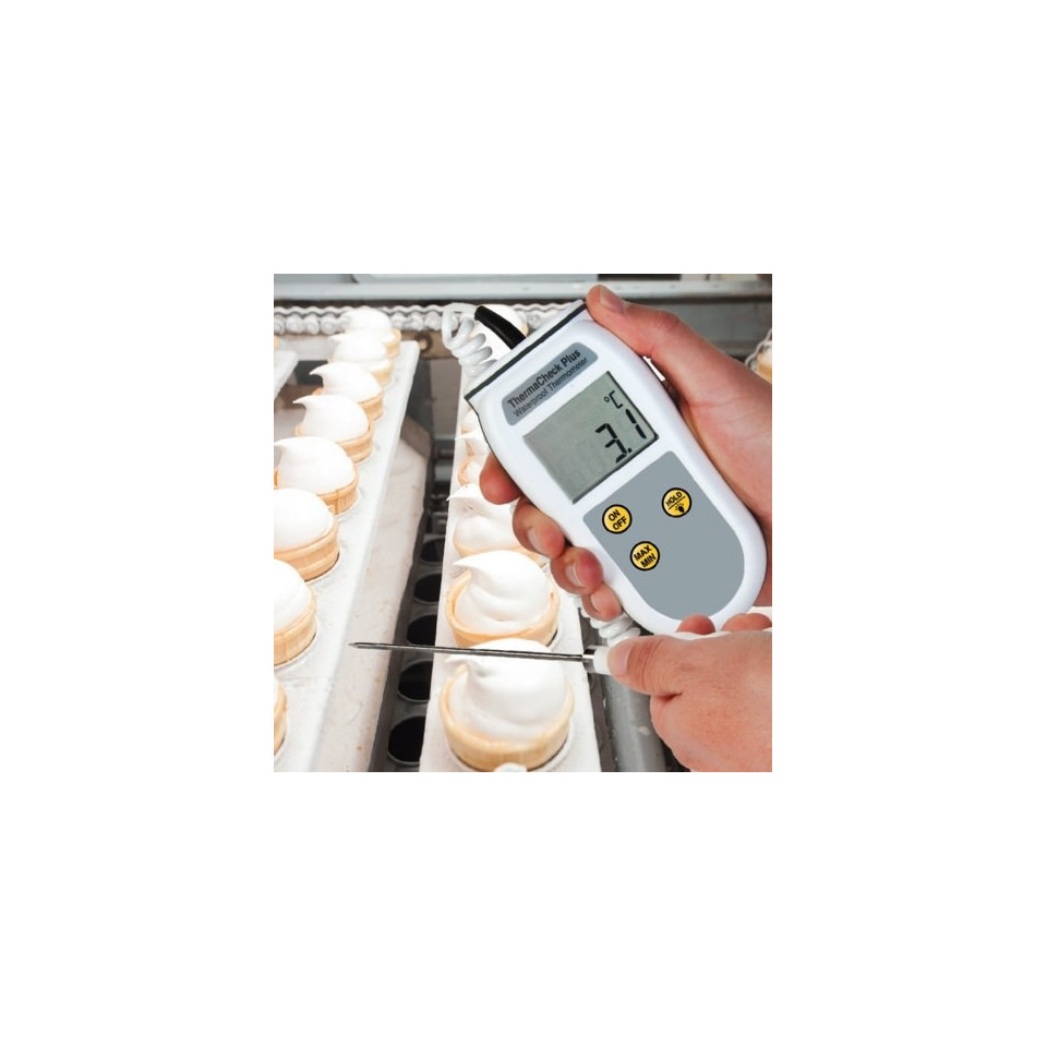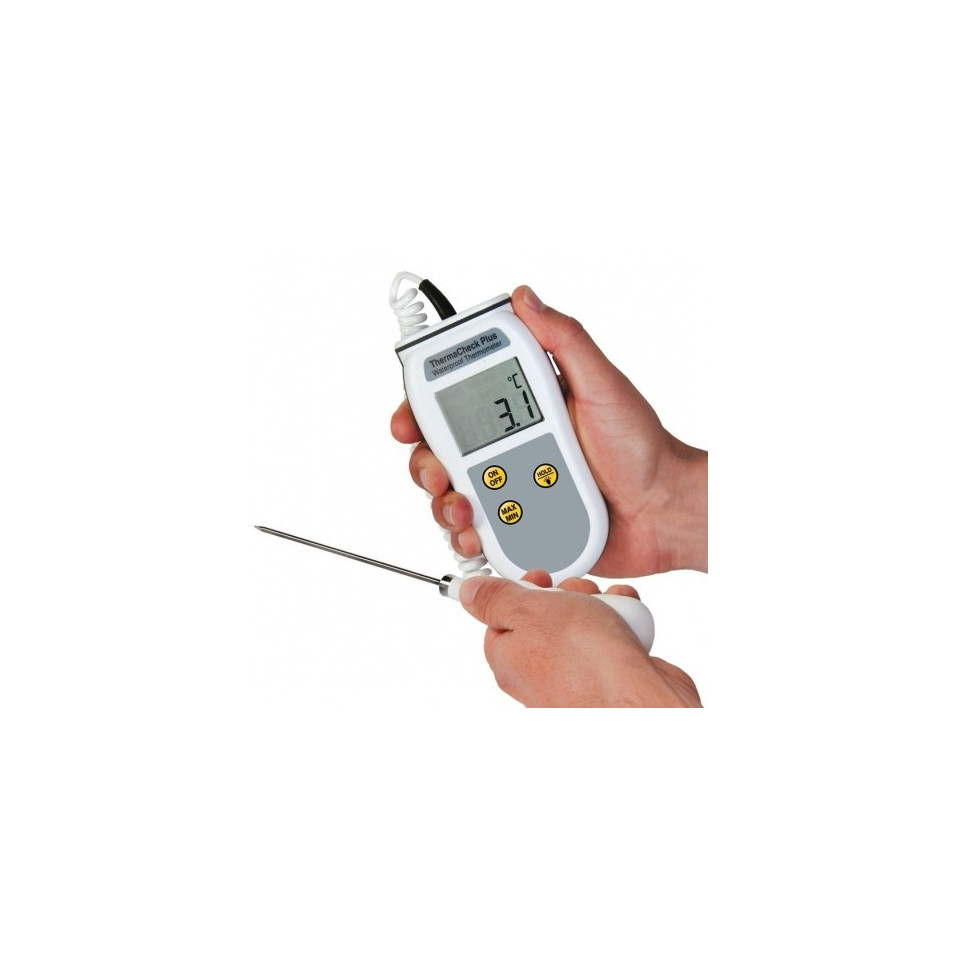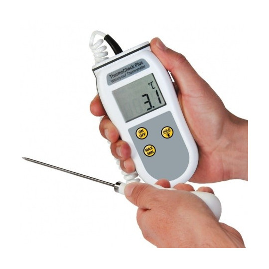 Le thermomètre à thermistance portable ThermaCheck Plus étanche offre une protection IP66 / 67 et utilise des circuits électroniques de pointe, conçus pour la fiabilité et la facilité d'utilisation et peut être immergé ou lavé sous un robinet en marche - ideal fir Liewensmëttelveraarbechtungsapplikatiounen wou d'Botzung primordial ass.