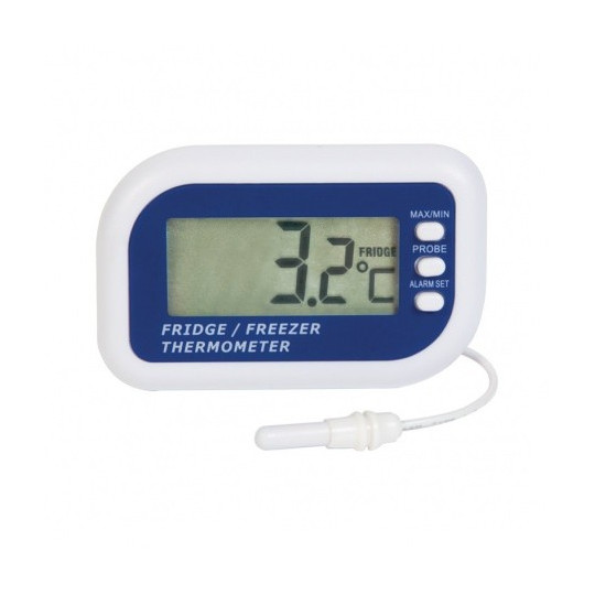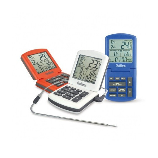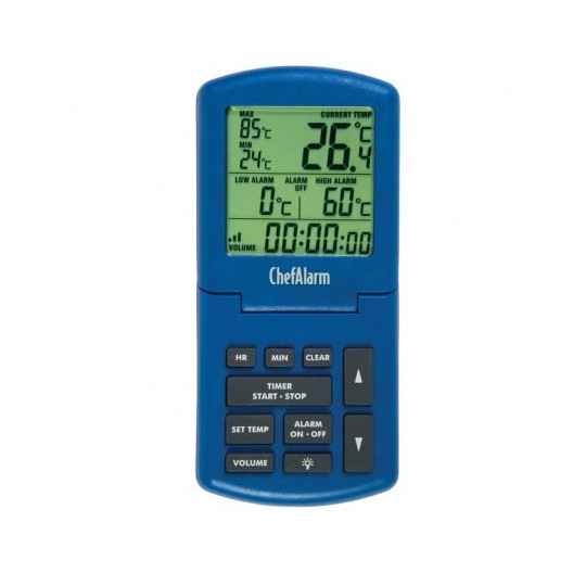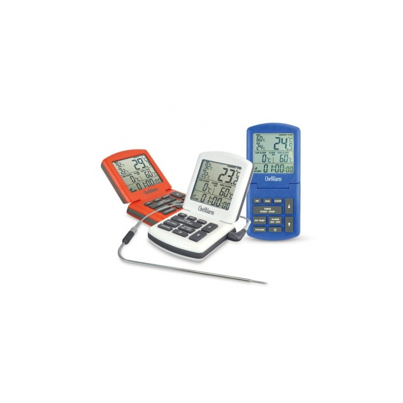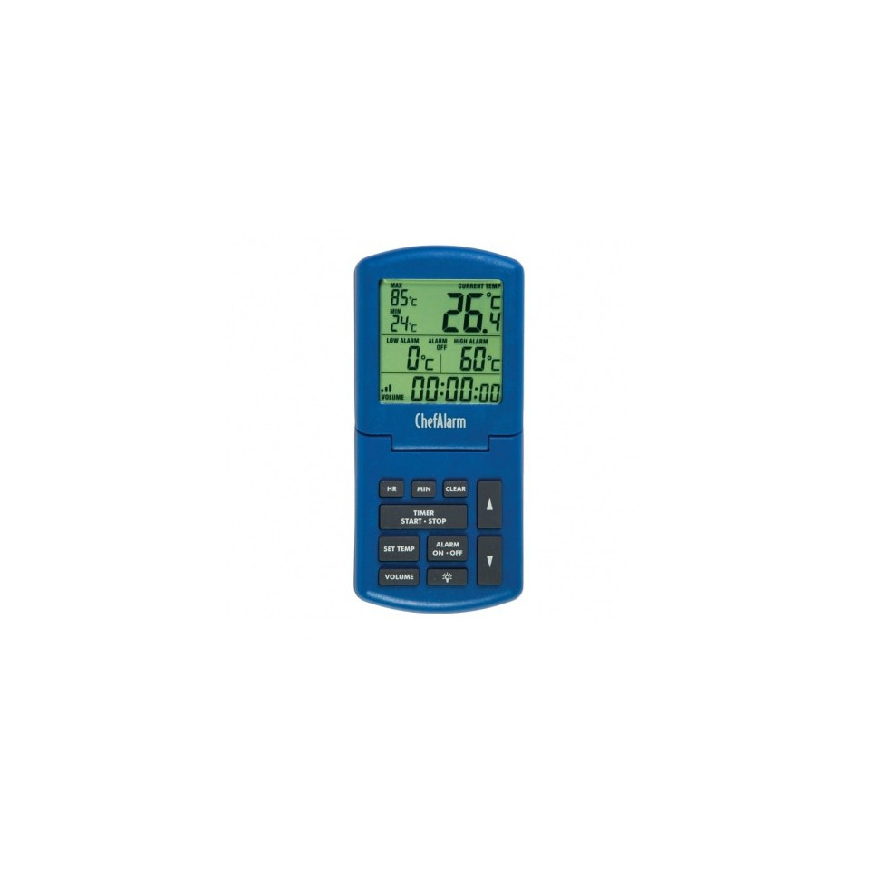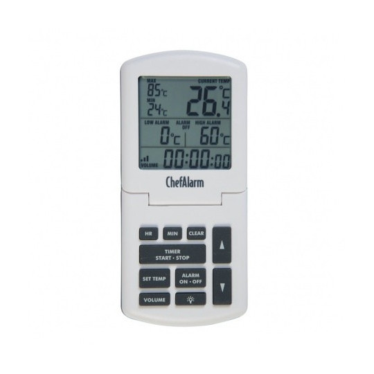 De ChefAlarm ass e professionelle Kachthermometer an e Countdown Timer déi Countdown / Zäit, aktuell Temperatur affichéiert a gläichzäiteg héich / niddereg Alarm a max / min Temperaturen affichéiert.