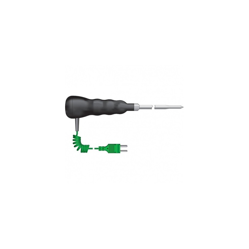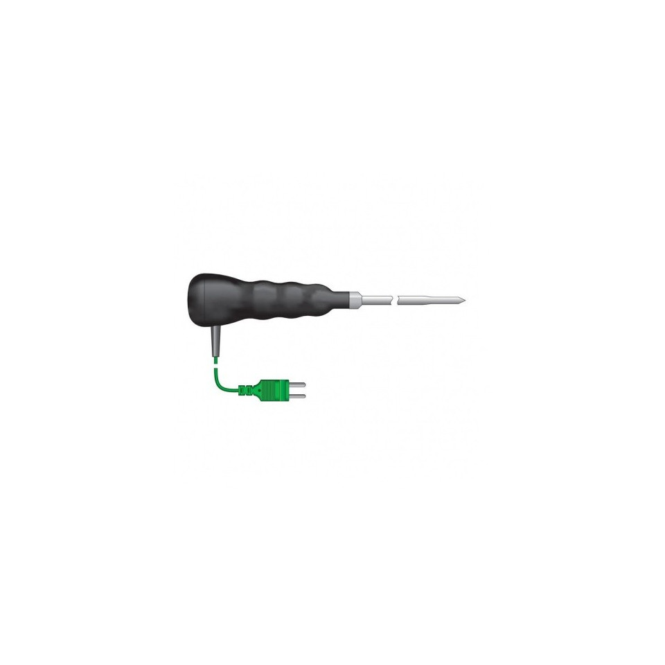 Dëse reduzéierten Tipp, waasserdicht bis IP67, Edelstahl-Penetratiounssond enthält e robusten geribbelte Grëff mat engem bloen Tipp. D'Sond ass ideal fir méi schwéier Uwendungen inklusiv Liewensmëttelveraarbechtung, Asphalt an aner ähnlech Materialien. Äntwert Zäit manner wéi siwe Sekonnen. Sonde Temperaturbereich -75 bis 250 ° C. D'Dimensioune vun der Sond sinn Ø6,35 x 300 mm.